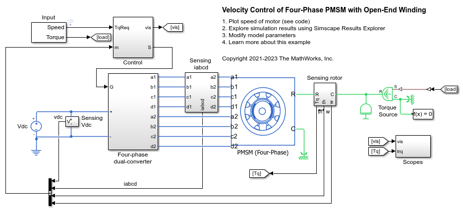 この例では、開放端の巻線をもつ四相永久磁石同期機 (PMSM) を使用する電気牽引駆動装置において、回転子の角速度を制御する方法を説明します。Open-End PMSM (Four-Phase) ブロックのソース コードを表示するには、ブロックをダブルクリックし、[説明] タブで [ソース コード] ハイパーリンクをクリックします。DC 電圧源は、2 台の制御された四相コンバーターを通して PMSM に電力を供給します。PMSM は、負荷に応じてモーター モードと発電機モードの両方で動作します。理想的なトルク源が負荷を提供します。Scopes サブシステムには、シミュレーション結果を確認できるスコープが含まれています。Control サブシステムには、外側の角速度制御ループと内側の 4 つの電流制御ループをもつ、PI ベース カスケード制御構造が含まれています。1 秒間のシミュレーション中、角速度要求は 0 rpm、500 rpm、2000 rpm、3000 rpm になります。