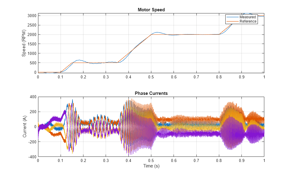 次のプロットは、テストで要求された速度と測定された速度、および電気駆動システムの相電流を示しています。