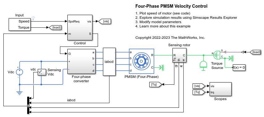 この例では、四相永久磁石同期機 (PMSM) をベースとする電気牽引駆動装置において、回転子の角速度を制御する方法を説明します。DC 電圧源が、制御された四相コンバーターを通して PMSM に電力を供給します。PMSM は、負荷に応じてモーター モードと発電機モードの両方で動作します。理想的なトルク源が負荷を提供します。Scopes サブシステムには、シミュレーション結果を確認できるスコープが含まれています。Control サブシステムには、外側の角速度制御ループと内側の 4 つの電流制御ループをもつ、PI ベース カスケード制御構造が含まれています。1 秒間のシミュレーション中、角速度要求は 0 rpm、500 rpm、2000 rpm、3000 rpm になります。