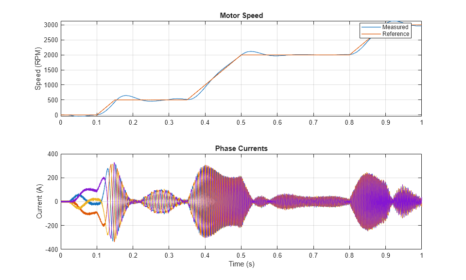 以下のプロットは、テストで要求された速度と測定された速度、および電気駆動システムの相電流を示しています。