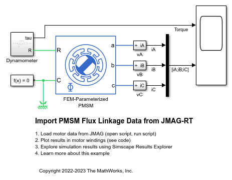 モーターの鎖交磁束とトルクを定義するデータ ファイルは、JSOL Corporation の許可を得て、JMAG-RT モデル データ ファイル 1k_S_C_IV.rtt から変換されてこの例に含まれています。JMAG-RT モデル データ ファイルは磁束とトルクのルックアップ テーブルで、JMAG-Designer を使用して計算されたものです。JMAG-RT Viewer (https://www.jmag-international.com/products/rt-viewer/) を使用して、JMAG-RT モデル データ ファイルを MATLAB® のバイナリ (*.mat) データ ファイルに変換できます。JMAG-RT Viewer から、この例のモーターの寸法、定格出力などの詳細にもアクセスできます。この例では、sschdladvisor による HDL コードの生成はサポートされていません。