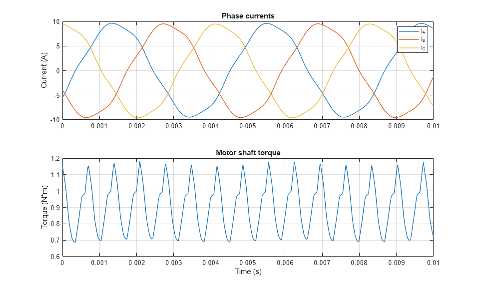 このプロットは、回転子の電気角が固定子の角度より 90 度先行しているときのシミュレーションによるモーターの電流とシャフトのトルクを示しています。トルクに、スロットと磁気飽和による高調波成分が含まれていることがわかります。