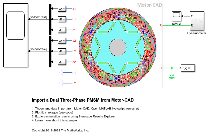 この例では、六相モーター設計を Motor-CAD から Simscape™ シミュレーションにインポートする方法を示します。この独特なモーターは、デュアル Y 結線で構成されています。この例は実装の派生を提示するものであり、これを変更して他の巻線構成を表すことができます。