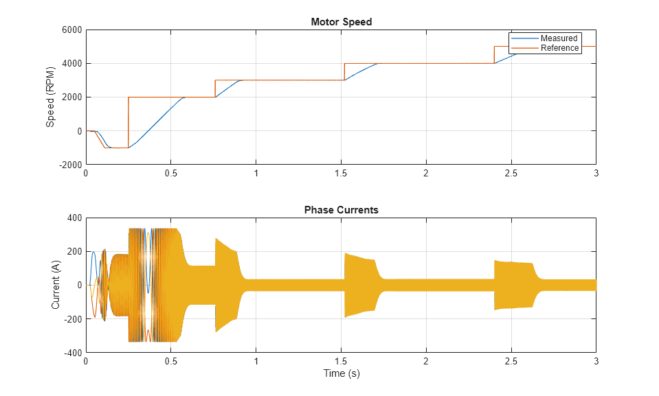 以下のプロットは、テストで要求された速度と測定された速度、および電気駆動システムの相電流を示しています。
