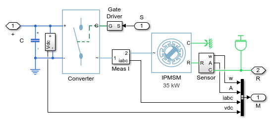 この例では、単純化された直列ハイブリッド電気自動車 (HEV) を推進する埋込永久磁石同期機 (IPMSM) を説明します。高電圧バッテリーに接続された理想的な DCDC コンバーターは、制御された三相コンバーターを通して IPMSM に電力を供給します。内燃エンジン駆動の発電機により高電圧バッテリーが充電されます。車両のトランスミッションと差動装置は、ギア減速比の固定されたモデルを使用して実装されています。Vehicle Controller サブシステムは、運転者の入力を、IPMSM と発電機用の関連指令値に変換します。Drive Controller サブシステムは IPMSM のトルクを制御します。コントローラーにはマルチレートの PI ベース制御構造が含まれています。開ループのトルク制御のレートは、閉ループの電流制御のレートより遅くなっています。コントローラーのタスク スケジューリングは、Stateflow® ステート マシンとして実装されます。Scopes サブシステムには、シミュレーション結果を確認できるスコープが含まれています。