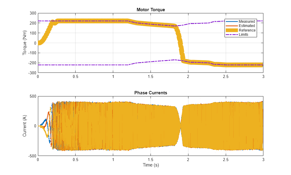以下のプロットは、テストで要求され、測定されたトルク、および電気駆動の相電流を示しています。