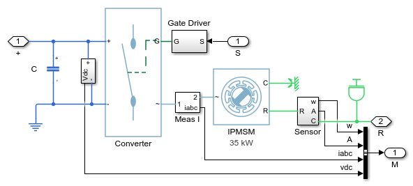 この例では、単純化された車軸駆動電気自動車を推進する埋込永久磁石同期機 (IPMSM) を説明します。高圧バッテリーは、制御された三相コンバーターを通して IPMSM に電力を供給します。IPMSM は、モーター モードと発電機モードの両方で動作します。車両のトランスミッションと差動装置は、ギア減速比の固定されたモデルを使用して実装されています。Vehicle Controller サブシステムは、運転者の入力を、関連するトルク指令に変換します。Drive Controller サブシステムは IPMSM のトルクを制御します。コントローラーにはマルチレートの PI ベース制御構造が含まれています。開ループのトルク制御のレートは、閉ループの電流制御のレートより遅くなっています。コントローラーのタスク スケジューリングは、Stateflow® ステート マシンとして実装されます。Scopes サブシステムには、シミュレーション結果を確認できるスコープが含まれています。
