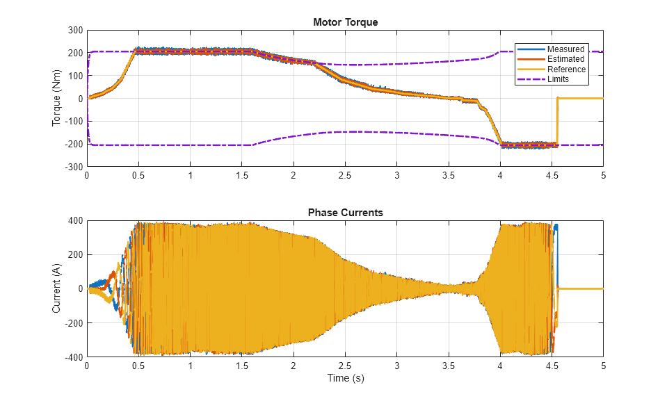 以下のプロットは、テストで要求され、測定されたトルク、および電気駆動の相電流を示しています。