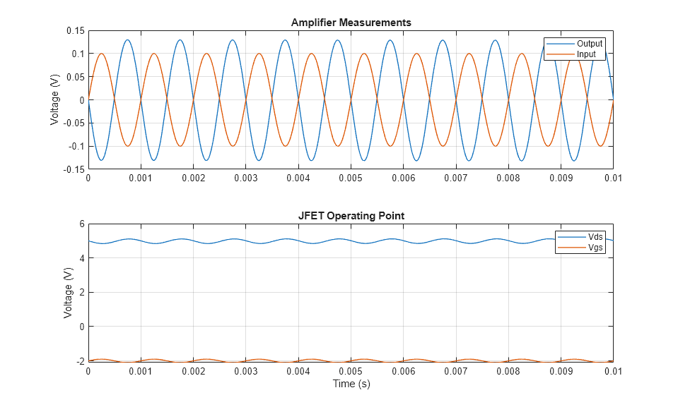 以下のプロットは、アンプ回路の電圧を示しています。上のプロットはアンプのゲインを示し、下のプロットは、JFET が目的の操作点付近でテストされていることを示します。