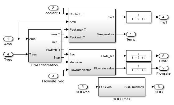 Coolant Control サブシステムはバッテリー パック内の最小温度と最大温度を追跡します。このサブシステムは、パック内のセルの最小温度と最大温度の差と、パック内の最大温度と端子 Amb の値の差のうち、最大値に基づいて流量を計算します。差が 10℃以上の場合は [FlwR] が 1 に設定され、それ以外の場合は 0 (それぞれのセル間に温度差がなくバッテリー パックの温度が端子 "Amb" での設定値に非常に近い状態) まで線形にスケーリングされます。この例で、冷却液の入口温度は定数であり、BatteryThermalManagementInitialization.m ファイルのワークスペース変数 coolantTemp で定義されています。