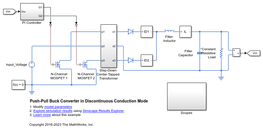 この例では、プッシュプル降圧コンバーターの出力電圧を制御する方法を説明します。インダクタを流れる電流は、MOSFET のスイッチ オフ サイクル中にゼロに達するため、この DC-DC コンバーターは不連続伝導モード (DCM) で動作します。この伝導モードは、主に低電力の用途で使用されます。入力 DC 電圧を定格出力電圧に変換して維持するために、PI Controller サブシステムでは単純な積分制御を使用します。起動時に、基準電圧が目的の出力電圧まで上昇します。