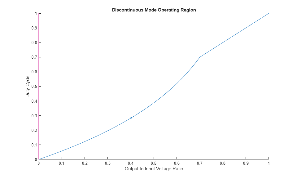 出力電圧比とデューティ比間のプロットを生成することによって、異なる K の値について動作モードを可視化できます。このプロットから、選択した特定の K の値に対する設計パラメーターで指定される、出力電圧比の達成に必要な対応するデューティ比を見つけます。