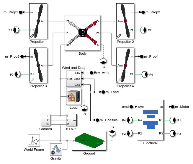 クワッドコプターの本体を CAD で設計し、モデルを Simscape™ Multibody™ にインポートできます。高速シミュレーションを可能にするために、電気モーターは電力変換のダイナミクスを抽象的にキャプチャします。クワッドコプターは、最終ウェイポイントに到達してドローンが一連のリリース条件を満たすと、荷物をリリースします。この例の詳細については、次の手順に従って Web ブラウザーで開く概要を確認するか、Quadcopter Drone Model in Simscape (MATLAB Central File Exchange) を参照してください。