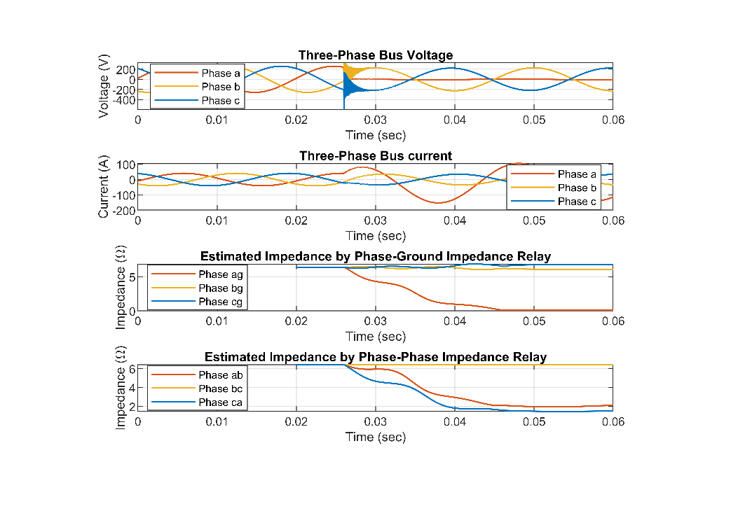 この例では、AC マイクログリッドの距離リレーをモデル化する方法を説明します。Relay ブロックは、インピーダンス リレー特性とモー リレー特性で構成されています。この例を使用して、さまざまな故障状態におけるインピーダンス リレーとモー リレーのパフォーマンスを調べることができます。いずれのリレーにも、地絡故障用と線間故障用の 2 種類のリレーがあります。