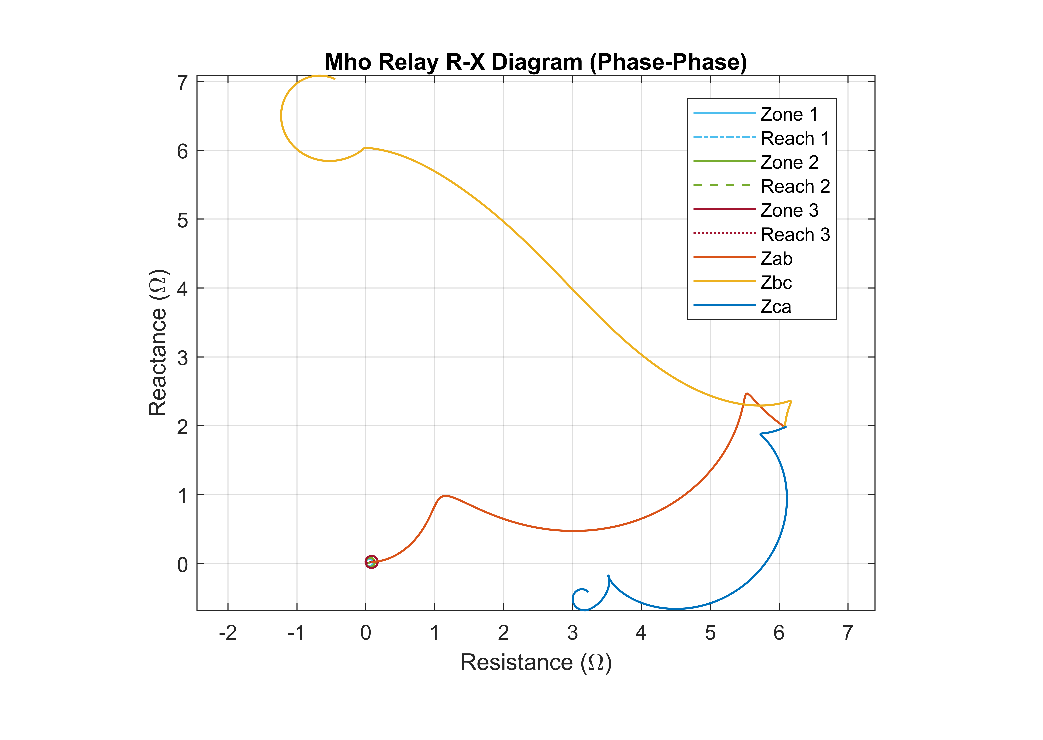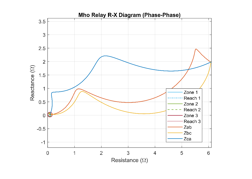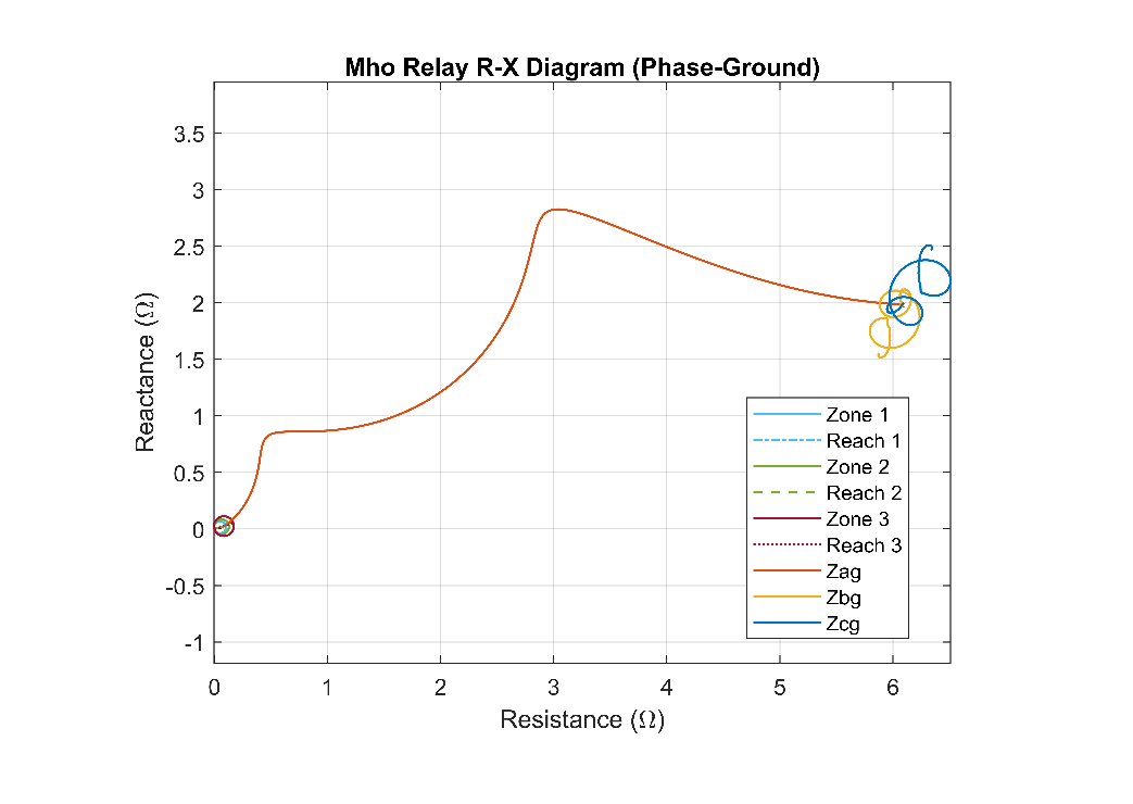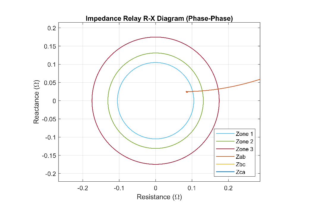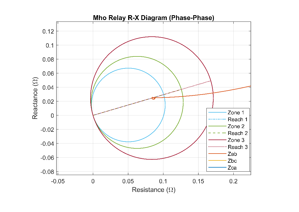 以下のプロットは、線間モー リレーの R-X 図を示しています。伝送線路の Sector 1 で二相 (a-b) 故障が開始されます。この図は、線間インピーダンス (a-b) が減少してリレーのゾーン 1 に達することを示しています。