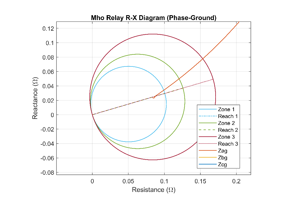 以下のプロットは、位相-接地モー リレーの R-X 図を示しています。この図は、位相-接地 (a-g) インピーダンスが減少してリレーのゾーン 1 に達することを示しています。