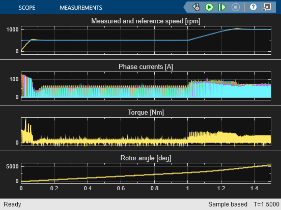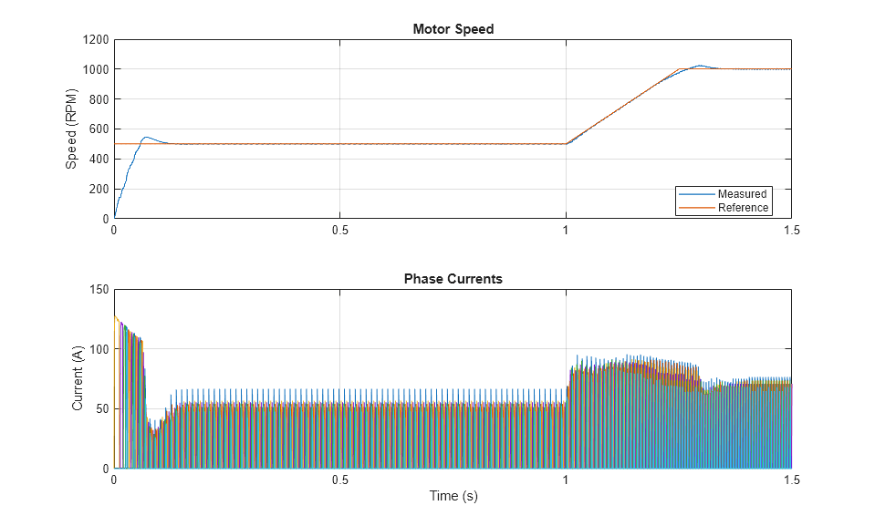 以下のプロットは、テストで要求された速度と測定された速度、および電気駆動システムの相電流を示しています。