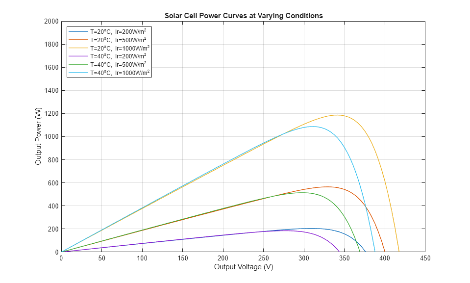 この例では、太陽電池アレイの電力-電圧曲線を生成する方法を示します。インバーターの設計には、電力-電圧曲線を理解することが重要です。理想的には、太陽電池アレイは常に、与えられた放射照度レベルとパネル温度でのピーク電力で動作していることになります。