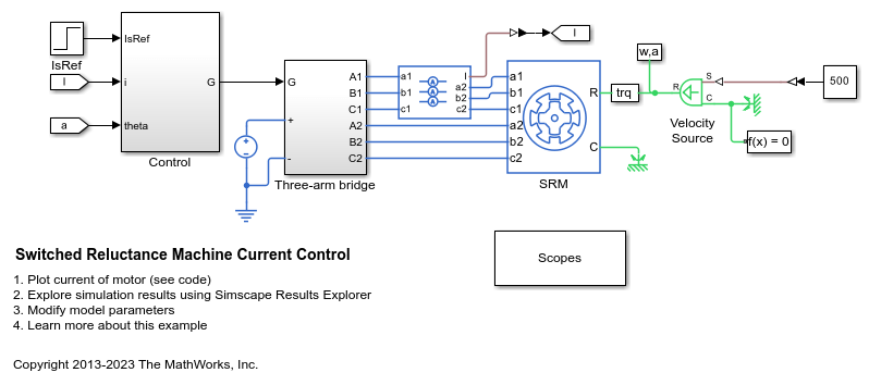 この例では、スイッチト リラクタンス機 (SRM) をベースとする電気駆動装置において、電流の大きさを制御する方法を説明します。DC 電圧源は、制御された 3 アーム ブリッジを通して SRM に電力を供給します。理想的な角速度源が負荷を提供します。コンバーターの点弧角と消弧角は一定に保たれます。PI ベースの電流コントローラーが電流の大きさを調整します。