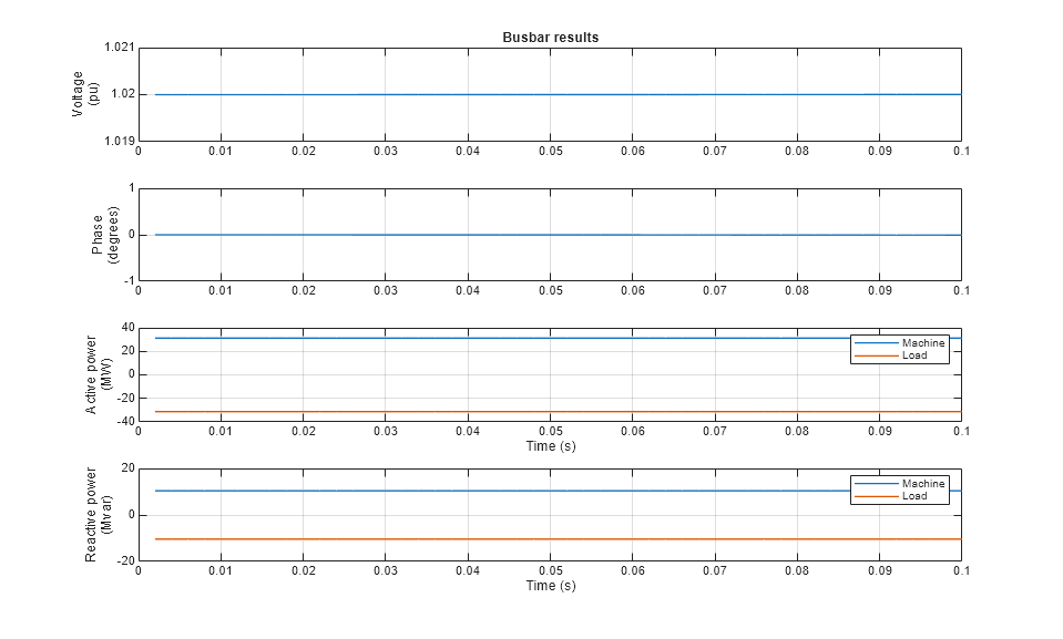 以下のプロットは、電力潮流のターゲットを満たすよう定常状態が初期化された後のシミュレーション結果を示しています。定常状態の解から離れたランプは、調速機と AVR がここでモデル化されていないことを反映しています。ただし、初期値は、電力潮流のターゲットが満たされていることを示しています。