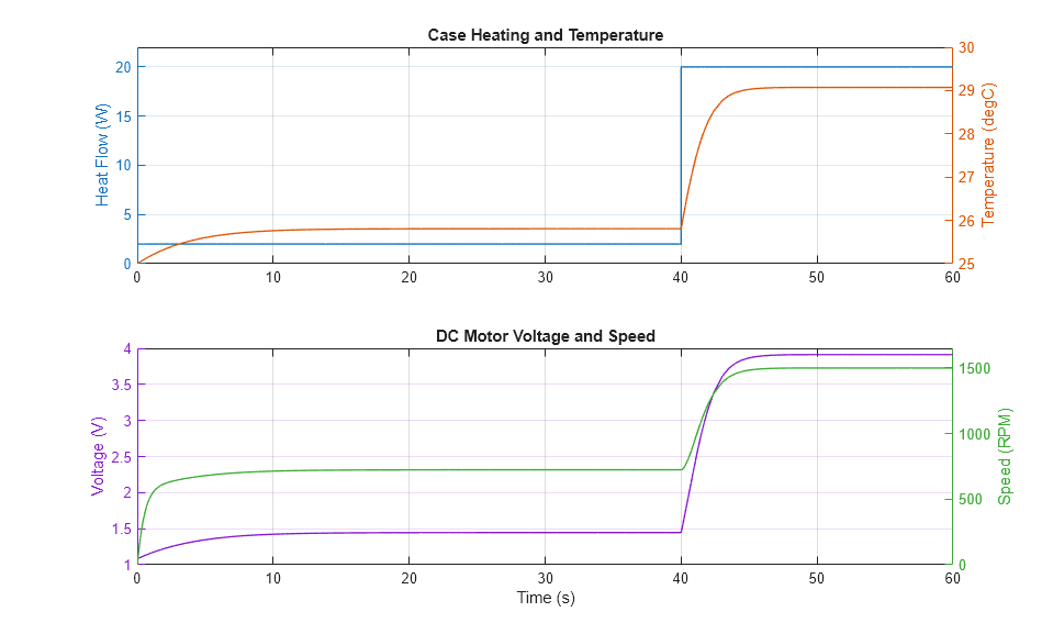 以下のプロットは、サーミスタ制御モーターの電気的動作、機械動作、および熱挙動を示しています。サーミスタの温度の変化に伴い、モーターに印加される電圧が変わります。これによりモーターの速度と、ケースからの対流熱伝達が変化します。システムは短時間で定常状態に達します。