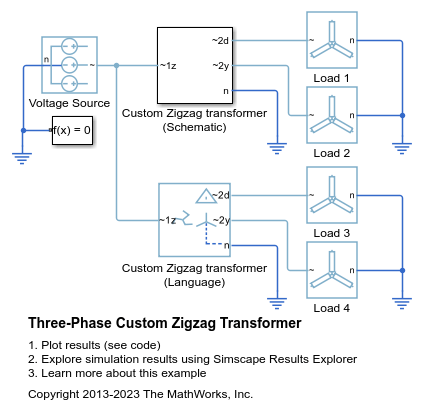 変圧器は、ジグザグ一次巻線、1 時 Δ 二次巻線および Y 二次巻線を使用して実装されます。ジグザグ巻線と Y 巻線の間の位相オフセットはブロック マスク パラメーターを使って指定できます。