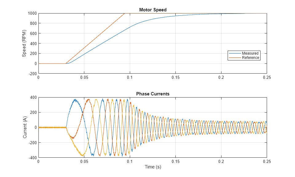 この例では、永久磁石同期機 (PMSM) をベースとする電気牽引駆動装置において、回転子の速度を制御する方法を示します。高電圧バッテリーは、制御された三相コンバーターを通して FEM-Parameterized PMSM ブロックに電力を供給します。Rotational Friction ブロックが負荷を提供します。位置と速度の情報は、高忠実度リゾルバーを使用して取得されます。PMSM controller サブシステムには、外側の速度制御ループと内側の 2 つの電流制御ループをもつカスケード制御構造が含まれています。0.25 秒のシミュレーションの間に、回転子の速度要求は 0 rpm から 1000 rpm まで上昇します。