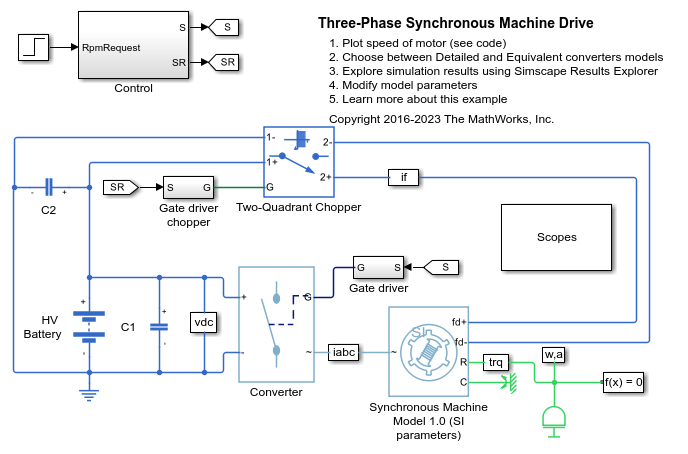 この例では、同期機 (SM) をベースとする電気駆動装置において、回転子の速度を制御する方法を説明します。高電圧バッテリーが、制御された固定子巻線用三相コンバーターと制御された回転子巻線用 2 象限チョッパーを通して SM に電力を供給します。モデルを使用して SM コントローラーを設計し、アーキテクチャとゲインを選択して必要なパフォーマンスを達成します。Scopes サブシステムには、シミュレーション結果を確認できるスコープが含まれています。