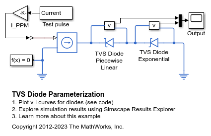 このモデルは、Simscape™ Electrical™ ダイオードをパラメーター化して過渡電圧抑制 (TVS) ダイオードをパラメーター化する方法を示します。この例は、誘導負荷の切断に関連する電圧過渡現象から自動車のエレクトロニクスを保護する用途に適した TVS ダイオード用です。データシートから抽出したデータを表示するには、[モデル化] タブの [設定] セクションで、[モデル設定]、[モデル プロパティ] をクリックします。[コールバック] タブで、[PreLoadFcn] をクリックします。