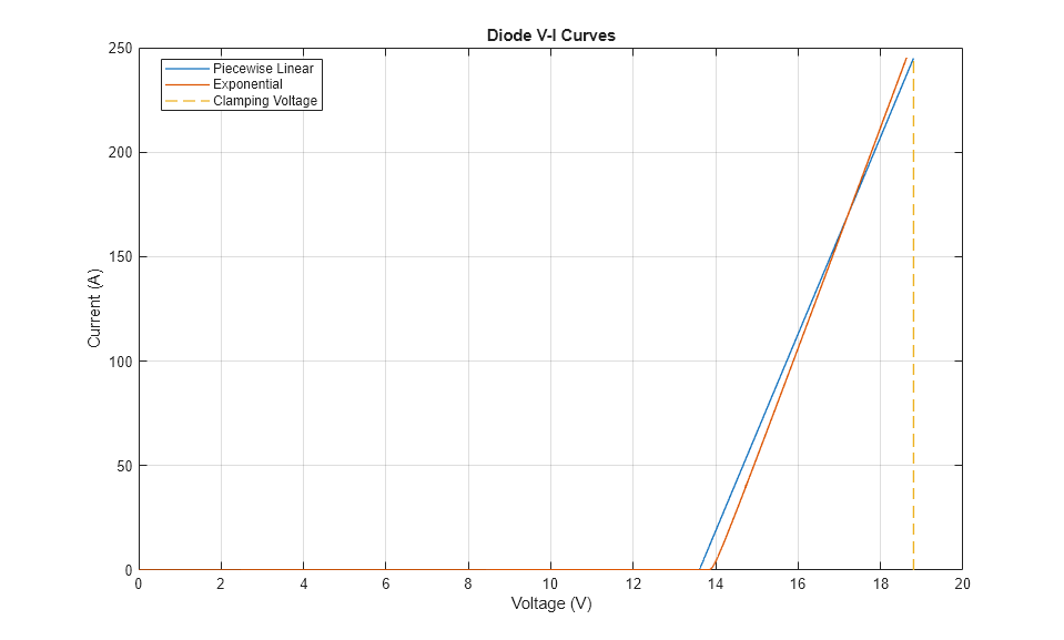 以下のプロットは、2 つの異なるダイオード モデルの電圧-電流曲線を示しています。区分的線形モデルと指数モデルは、どのようにパラメーター化されているかによって、類似した動作を実現できます。