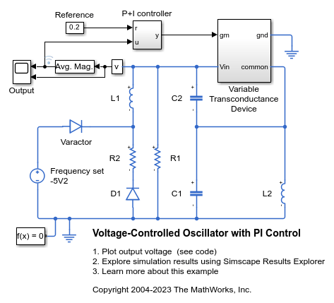 このモデルは、出力電圧を制御するフィードバック制御付きの電圧制御発振器を示します。発振周波数は、可変容量ダイオードに適用される逆バイアス電圧によって制御されます。このモデルは、回路を設計する際に動作のモデル化とコンポーネントレベルのモデル化をどのように混在させられるかを示しています。可変トランスコンダクタンス デバイスの動的応答が発振周波数と比較して高速であれば、実装の詳細は重要ではありません。同様に、PI コントローラーは抽象化されており、オペ アンプで実装することも、ソフトウェアに含めることもできます。