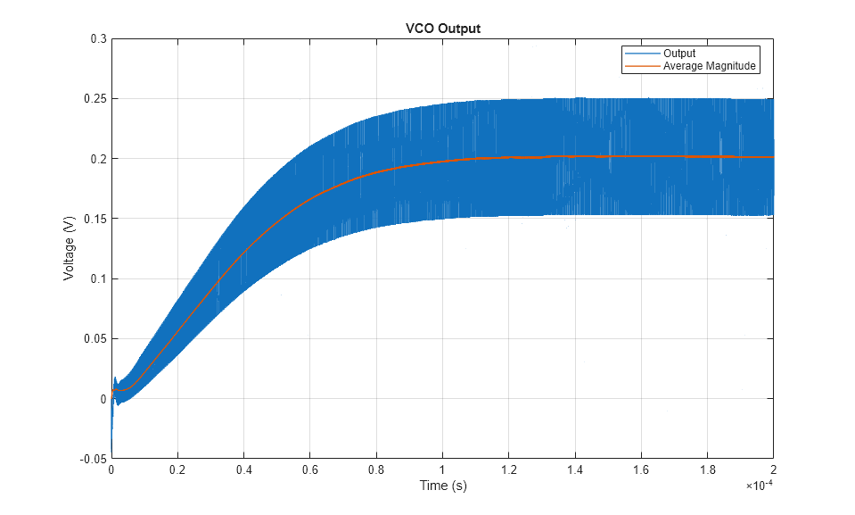 以下のプロットは、電圧制御発振器 (VCO) 回路の出力電圧を示しています。実際の出力と平均化された出力の両方が表示されています。PI コントローラーにより、発振が参照値 0.2 V を中心とすることが保証されます。