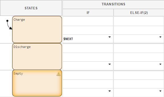 Transitions determine how and when your chart moves between states. Transitions appear in the Transitions column. In this table, each state has two associated transitions, If and Else-If(2).