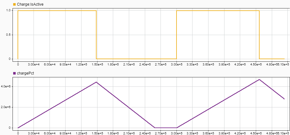 Chargestate is active andchargePctis greater than100.Toggle the Manual Switch block. In the Simulation tab, click Continue. The simulation pauses when the transition from