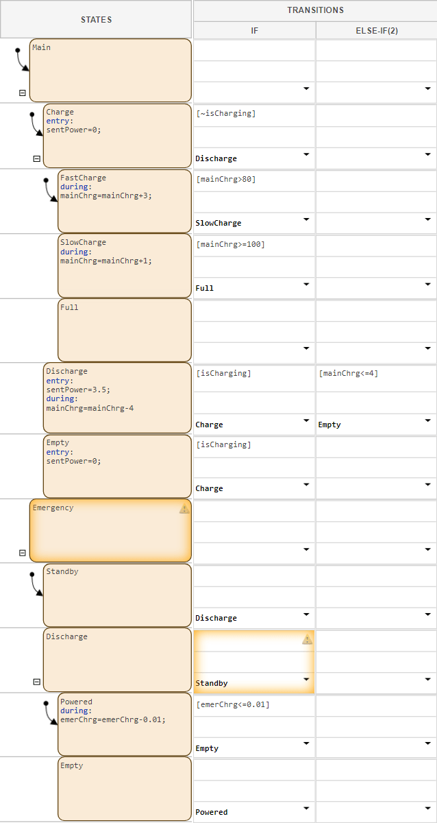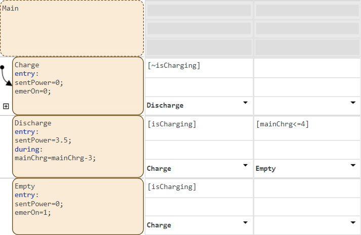 The table has two non-parallel states that represent the main and emergency batteries. Each battery has nested child states that represent operating modes for charging, discharging, running out of power, or standing by. Additionally, the batteries use these data:
