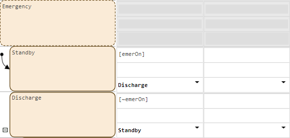 4. In Emergency, in the Discharge state, add a transition that activates the Standby state if emerOn is false.