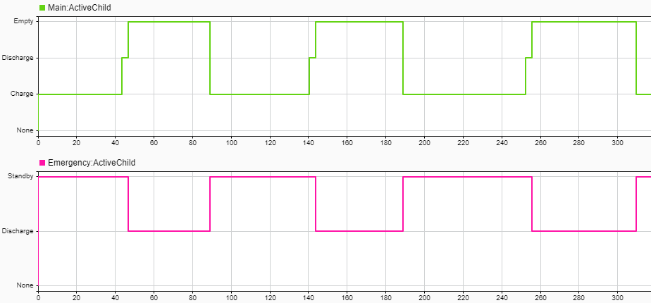 When using parallel states, you can trigger behavior one state based on the activity of another. For example, in the battery system, the emergency battery switches on only if the main battery becomes empty. In state transition tables, you can coordinate behavior across parallel states by assigning a value to local data in one state, and creating a transition condition that uses the local data in another state.