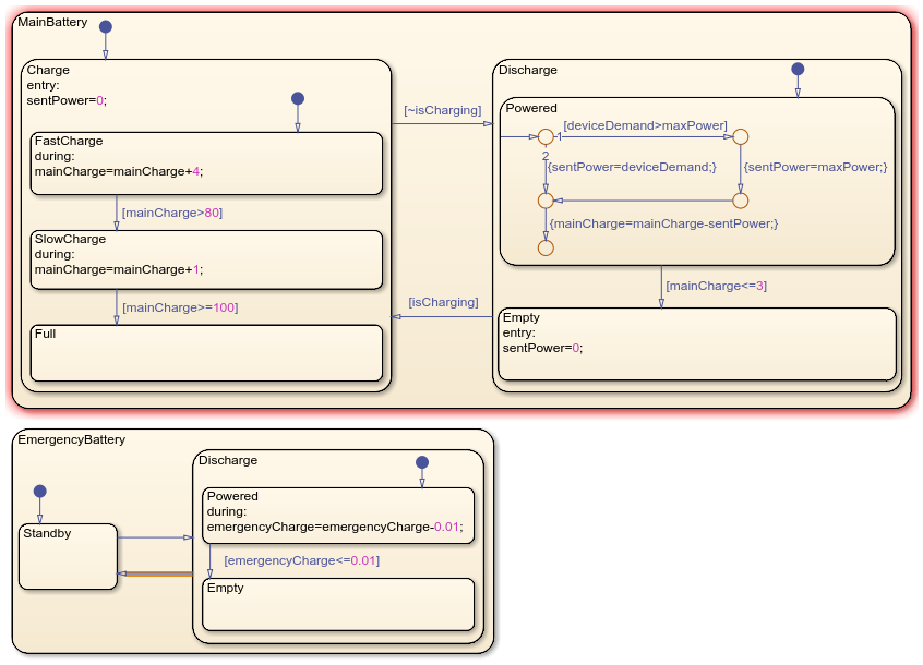 The chart contains two non-parallel states that represent the main and emergency batteries. Each battery contains nested child states that represent operating modes for charging, discharging, or standing by. Additionally, the batteries use input, output, and local data: