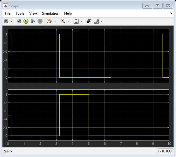 ステート A への入力は正弦波 u1、ステート B への入力は余弦波 u2 です。グラフィカル関数 out は、入力 in に対して関数 heaviside の値を出力します。