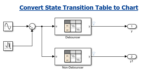 The State Transition Table block Debouncer debounces the input signal. You can compare this signal to the State Transition Table block Non-Debouncer, which does not debounce the input signal but has identical inputs, outputs, and states.