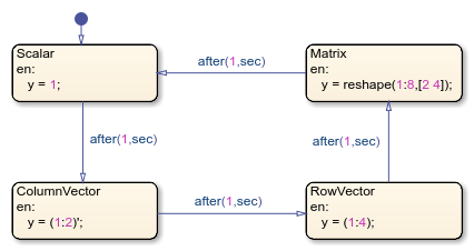 Stateflow チャート VarSizeSignalSource は MATLAB® をアクション言語として使用します。このチャートの時相論理によって、4 つのステート間の遷移がトリガーされます。各ステートは異なるサイズの出力値を生成します。これらは、スカラー、2 要素の列ベクトル、4 要素の行ベクトル、および 2 列 4 行の行列です。
