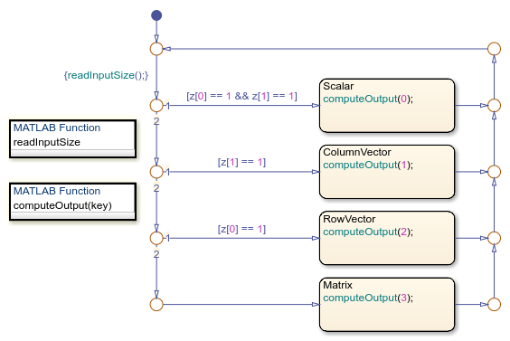 MATLAB 関数 isScalarInput は、チャート入力 u のサイズを特定します。この信号はチャート VarSizeSignalSource によって生成され、スカラー、2 行 1 列の列ベクトル、1 行 4 列の行ベクトル、または 2 行 4 列の行列にすることができます。この関数は、u の次元をチャートレベルの出力 z として保存します。