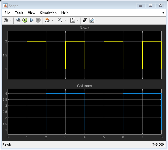 Scalarステート、ColumnVectorステート、RowVectorステート、VectorPartialステート、Matrixステートの間で循環していることがわかります。Simulink モデルでは、Display ブロック