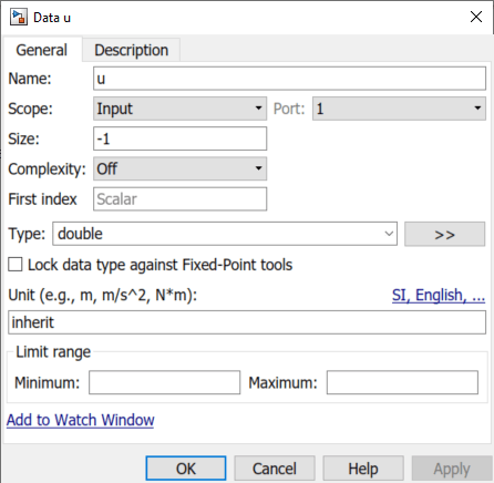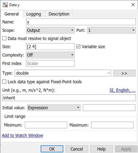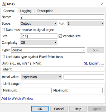 yは可変サイズ信号で、そのサイズと値は、uがスカラー、ベクトル、行列のいずれであるかによって異なります。uの [サイズ] プロパティは、信号の最大サイズである[2 4]に設定されています。