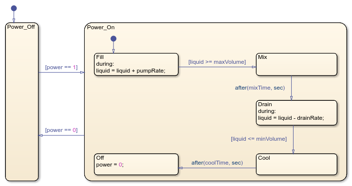 しかし、モデルをシミュレーションすると、チャートが Power_Off ステートに戻ることはありません。