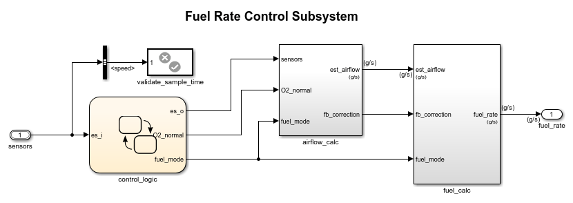 fuel_rate_control サブシステムは、システムのセンサーからの信号を使用して、理論混合気を得られる燃料比を決定します。燃料比はエンジンの気体力学モデル内で実際の空気流量と組み合わされて、排気時に検出される最終的な混合比を決定します。