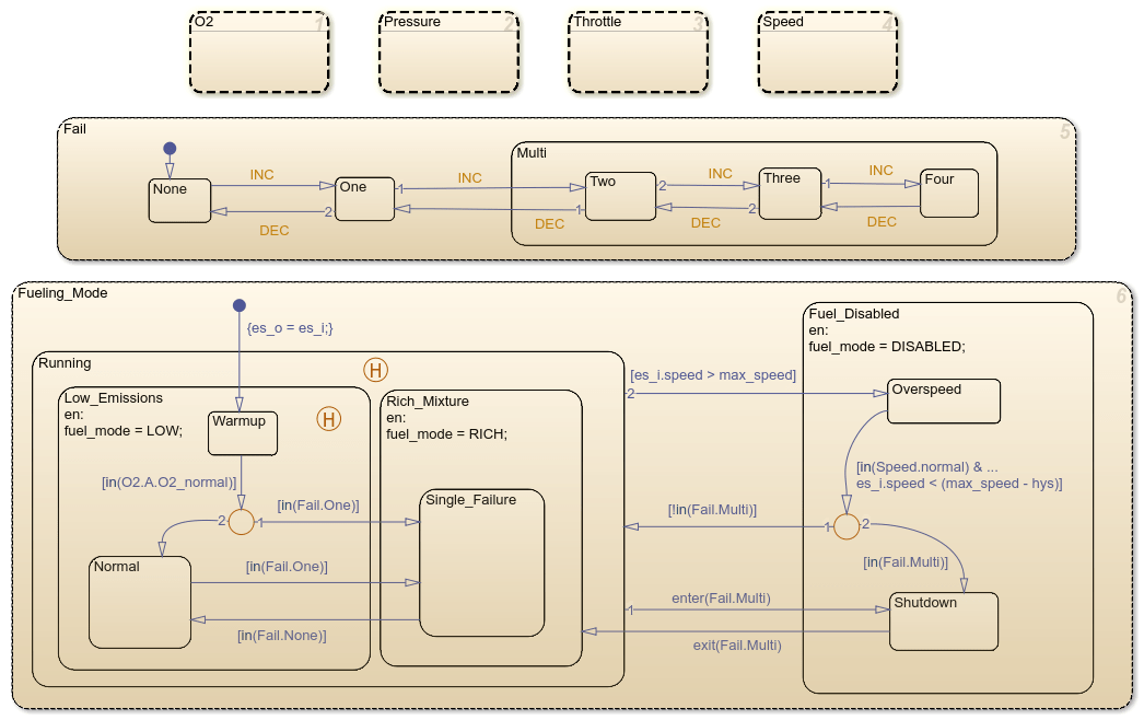 どのセンサーが故障したかにかかわらず、モデルは常に指示のあるイベント ブロードキャスト Fail.INC を生成します。こうすることで、汎用のセンサー故障ロジックのトリガーはセンサーに依存しません。モデルは、対応するセンサー回復イベント Fail.DEC も使用します。Fail ステートは、故障したセンサーの数を追跡します。カウンターは、Fail.INC イベントごとにインクリメントし、Fail.DEC イベントごとにデクリメントします。モデルはスーパーステート Multi を使用して、1 つを超えるセンサーが故障したすべてのケースをグループ化します。