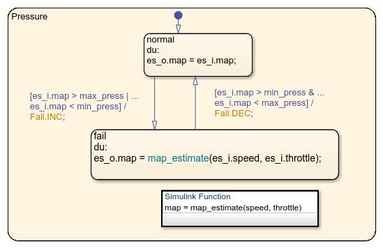 モデルは、マニホールド圧の推定値を、エンジン速度とスロットル位置の関数として計算します。この値を計算するため、モデルは Stateflow で Simulink 関数を使用します。