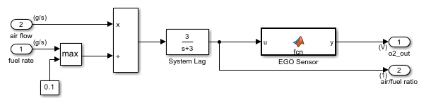 非線形酸素センサーは、EGO Sensor という名前の MATLAB Function ブロックを使用してモデル化されます。ブロックを表示するには、モデルの最上位レベルから Engine Gas Dynamics サブシステムに入ります。次に、Mixing & Combustion サブシステムに入ります。