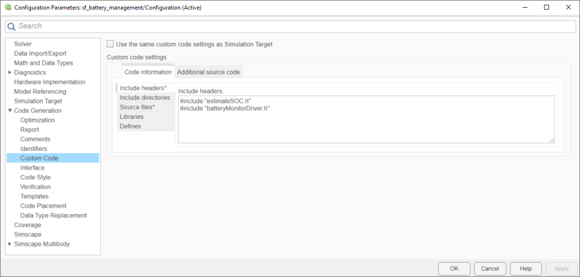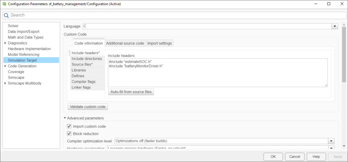 この例には、batteryMonitorDriver.h と batteryMonitorDriver.c の 2 つのカスタム C コード ファイルが含まれています。これらのファイルは、バッテリーの電圧、電流、温度など、システムからのセンサー データを取得するために使用するデバイス ドライバー コードを表します。また、コード生成にも使用されます。